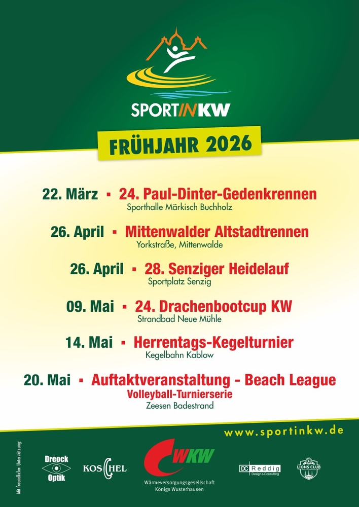 Frauenseelauf (05.03.2023) Bowling Cup gegen Gewalt und Drogen (06.03.2023) Paul-Dinter-Gedenkrennen (19.03.2023) Tag der offenen Tür beim Wassersportverein KW e.V. (22.04.2023) Senziger Heidelauf (23.04.2023) Mittenwalder GAAC-Altstadtrennen (30.04.2023) 21. Drachenbootcup Königs Wusterhausen (13.05.2023) Funkerbergmeeting (03./04.06.2023) Summer Opening 3x3 Streetballturnier (03.06.2023) Radtourenfahrt - Vor den Toren Berlins (17.06.2023) Sommerfest der Eintracht (01.07.2023) 111 jährigen Bestehen der SG Niederlehme (01.07.2023 und 07./08.07.2023) Zernsdorfer Kinderfest der Vereine (08.07.2023) Herbstregatta am Möllenzugsee (30.09 oder 01.10.2023) Lauf um den Krummen See (21.10.2023)